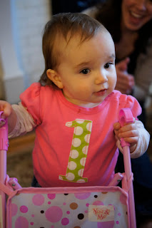 Anna is so cute and is just the perfect little person! She was totally fine during the party, didn't freak out even though there were a lot of people, she didn't go crazy with her cupcake, and she played with the other kids. One of her presents was a stroller, which she walked around with constantly as soon as she got it. We figured she was close to taking her first steps so we all tried to trick her into walking by holding a shiny cell phone or toy in front of her, but no luck. Then guess what?? This past Sunday she took her first steps! Yay!